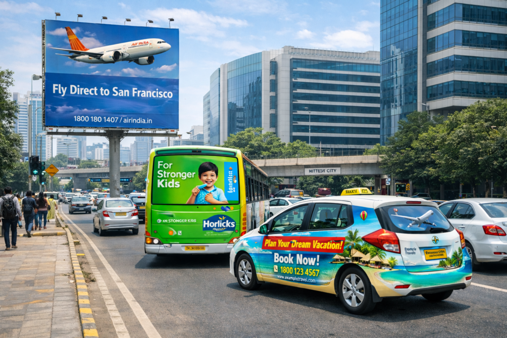 It depends on your objective. Hoardings work well for premium positioning, while buses and cabs help with repeated visibility across different city zones. Many brands combine formats for stronger impact.
