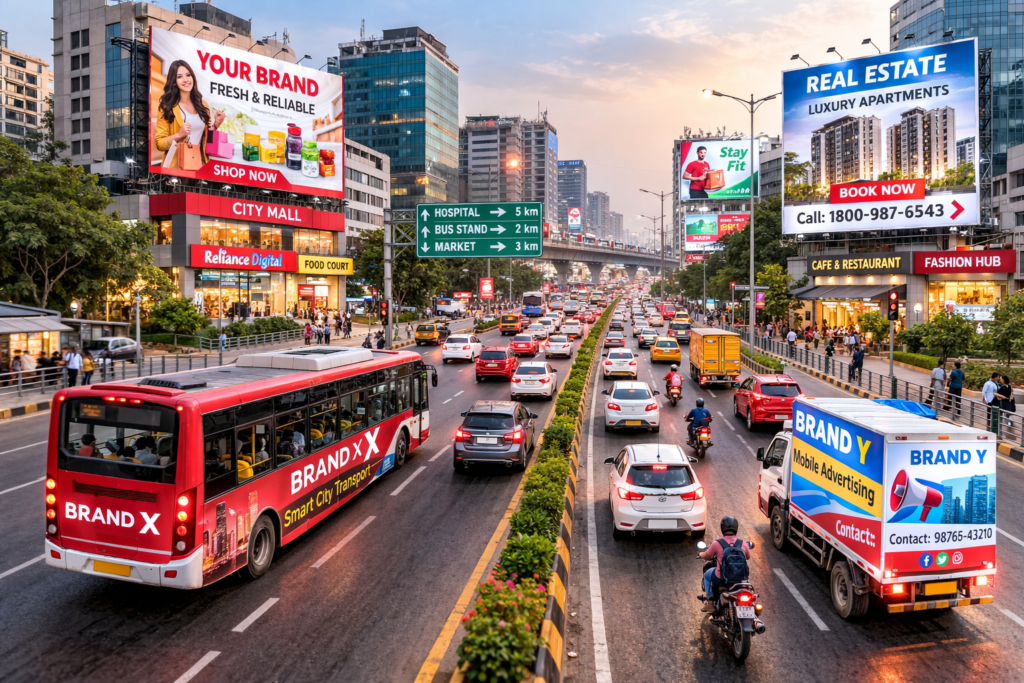 It depends on the objective. Hoardings create landmark presence, while bus branding adds repetition through movement. Many brands combine both for stronger recall.